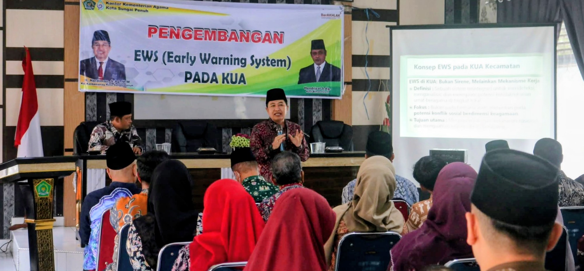 SUNGAI PENUH – Kantor Kementerian Agama (Kemenag) Kota Sungai Penuh melalui Seksi Bimbingan Masyarakat (Bimas) Islam menggelar kegiatan Pembangunan Early Warning System (EWS) atau Sistem Deteksi Dini Konflik Sosial Berdimensi Keagamaan, Rabu (13/8/2025), di Aula Kantor Kemenag Kota Sungai Penuh.