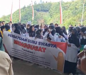 “Kami hanya ingin diperlakukan sama. Kami juga mendidik anak bangsa, tapi selalu ditempatkan di barisan belakang,” seru salah seorang guru saat aksi berlangsung.